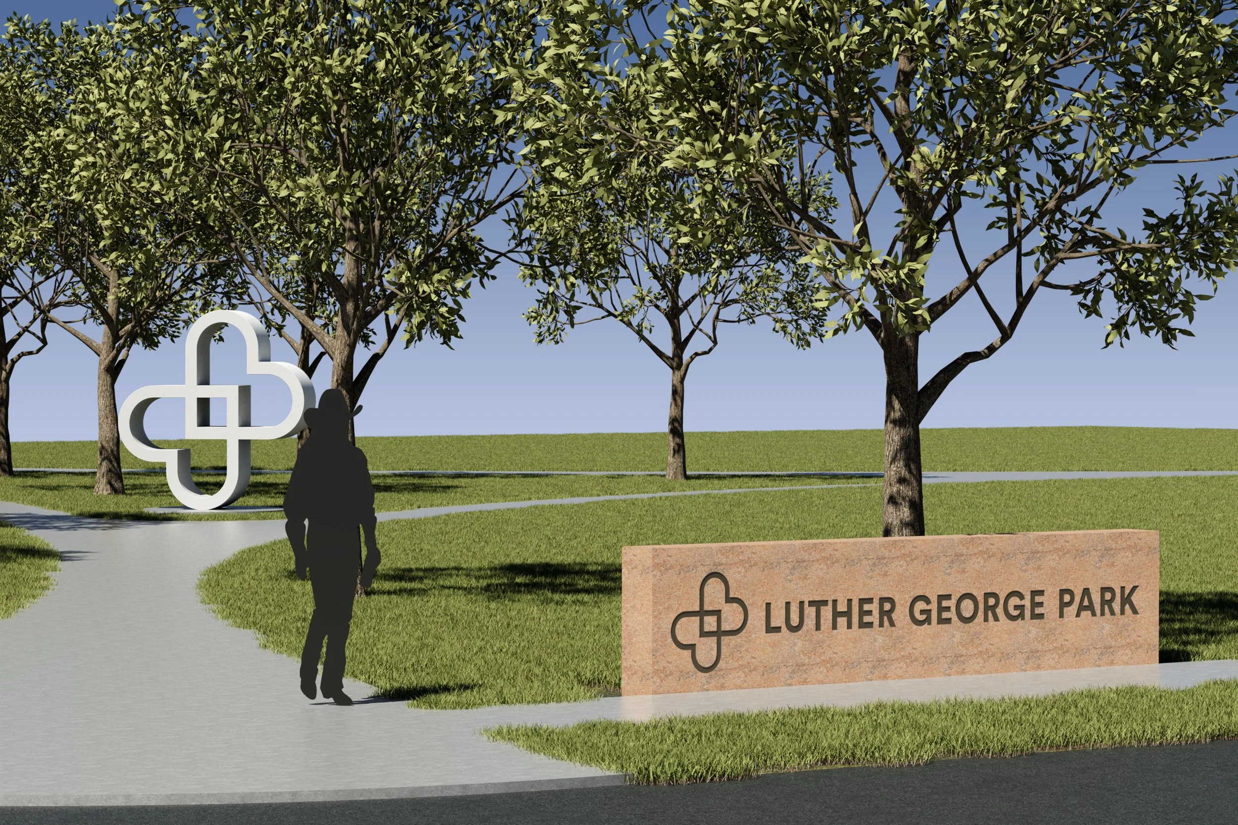 At the entrance, a striking 7.5-foot dimensional sculpture of the park icon welcomes visitors — an instant landmark and family gathering spot. A creative donor recognition system honors major supporters with hand-selected limestone pavers from a single quarry, and a sculptural grove of dimensional "reeds" celebrates broader fundraising efforts.